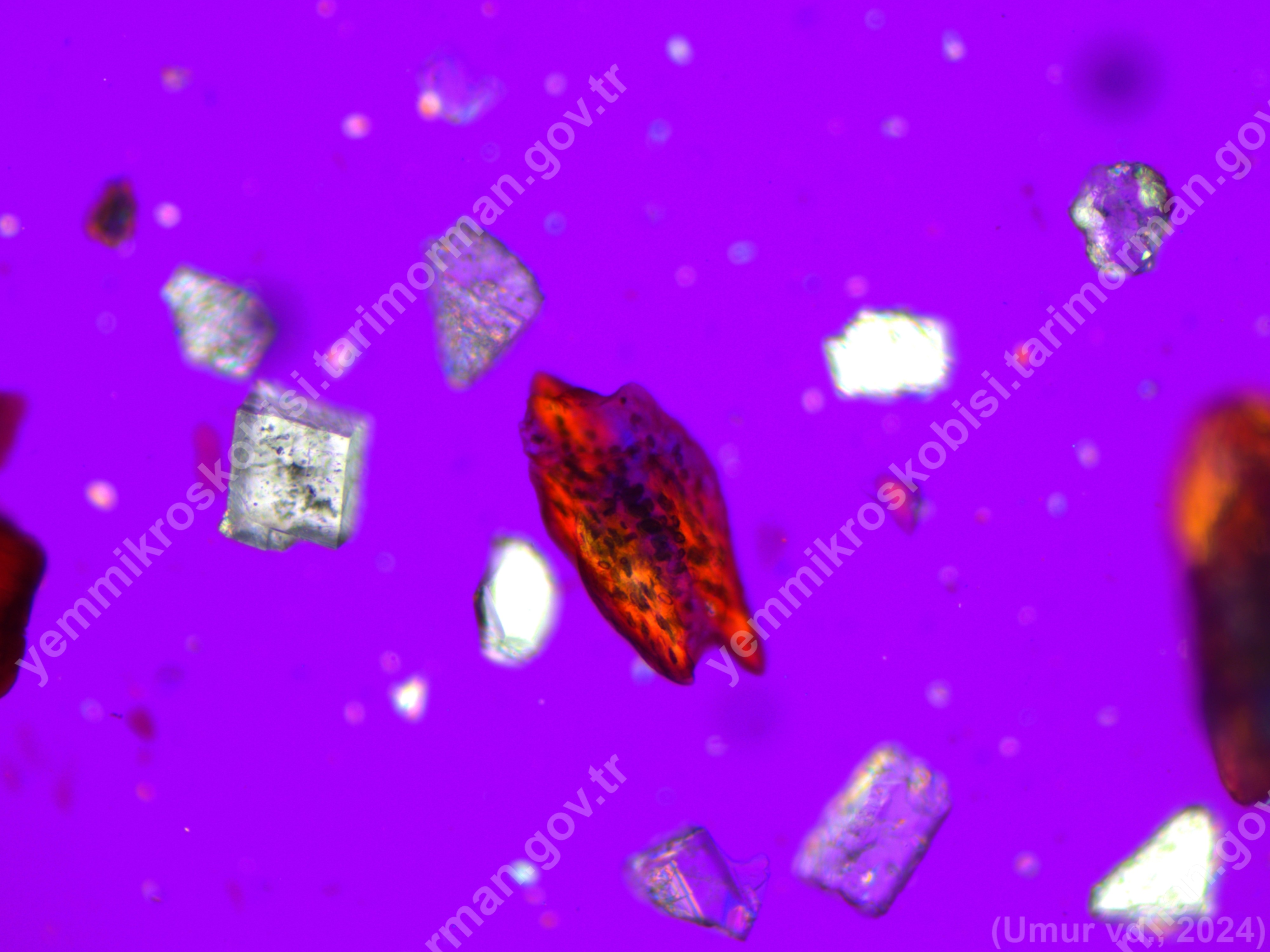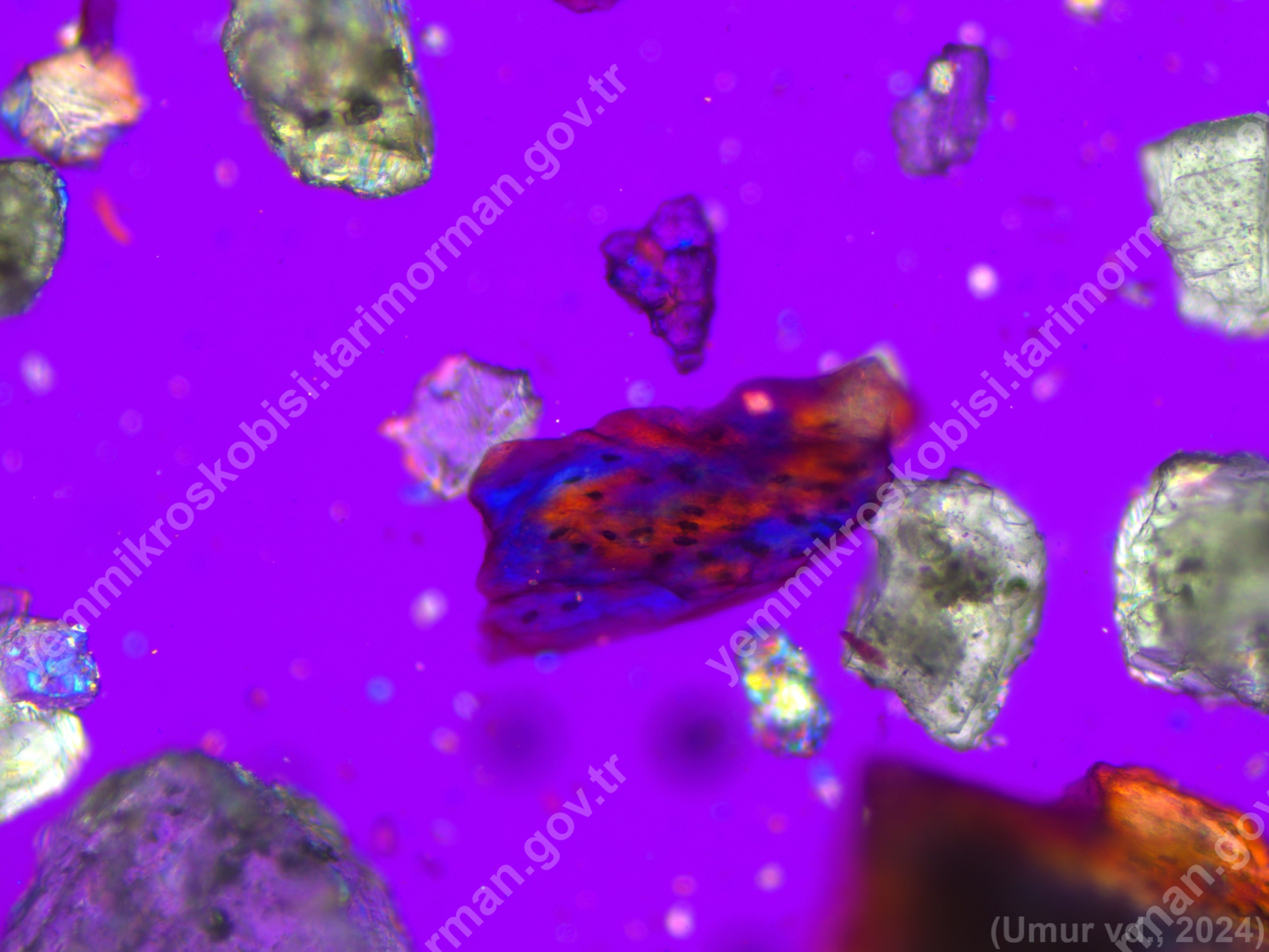 Sığır Besi Yemi | Bos taurus | Kemik Doku | Sediment< 200µ | Polarize | 100x | Alizarin Kırmızısı | ||